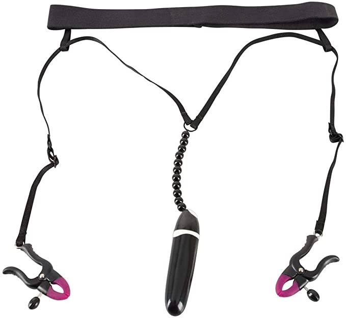 Un G-string accosorizat cu cleme pentru departarea labiilor cu vibrații!