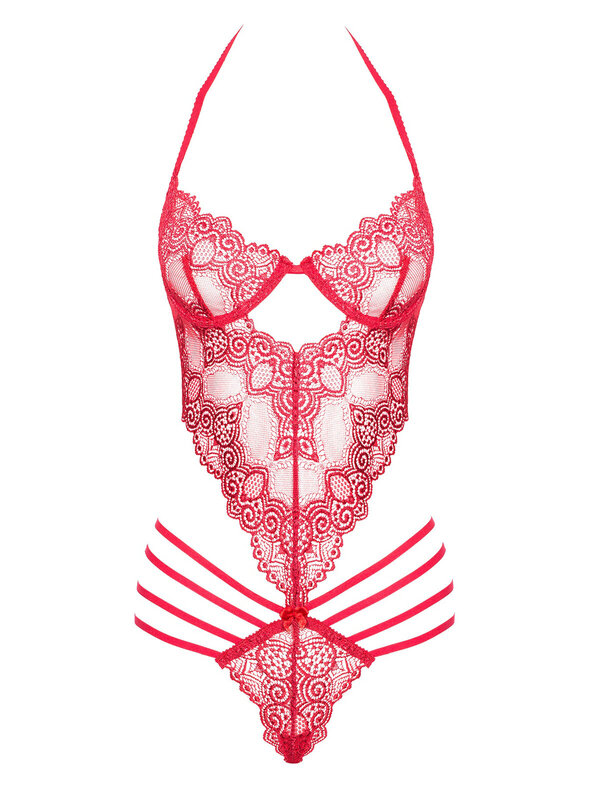 Body din dantela, fara decupaj inghinal, cu portjartier atasat si accesoriu pentru gat. Produsul NU include dresurile din imagine.