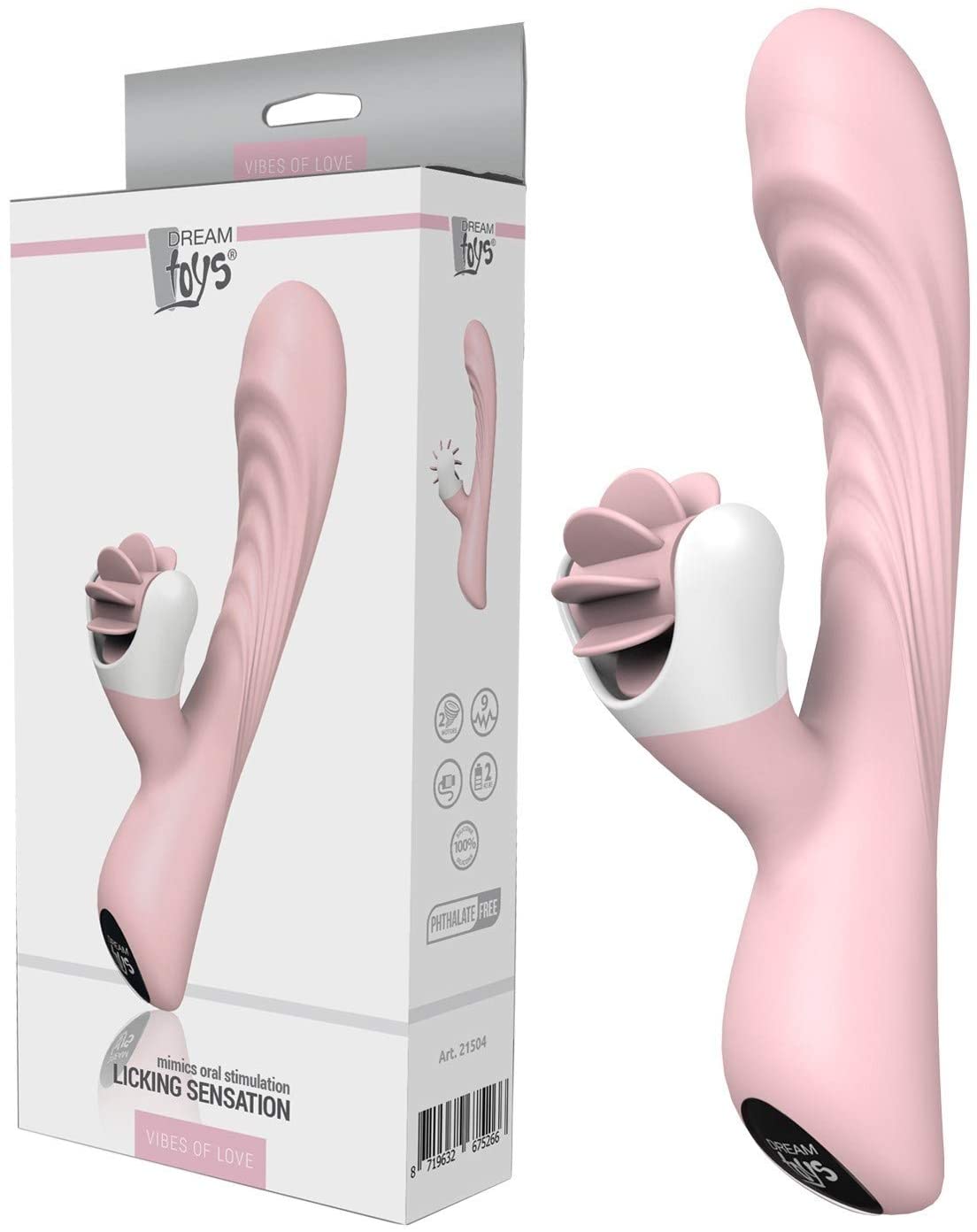 DREAM TOYS LICKING SENSATION este un vibrator reincarcabil si cu stimulator clitoridian sub forma de limbute rotative.