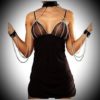 Rochie indrazneata ce are curele reglabile,fabricata din tesatura neagra elastica accesorizata cu lanturi argintii in dreptul sanilor si la spate.