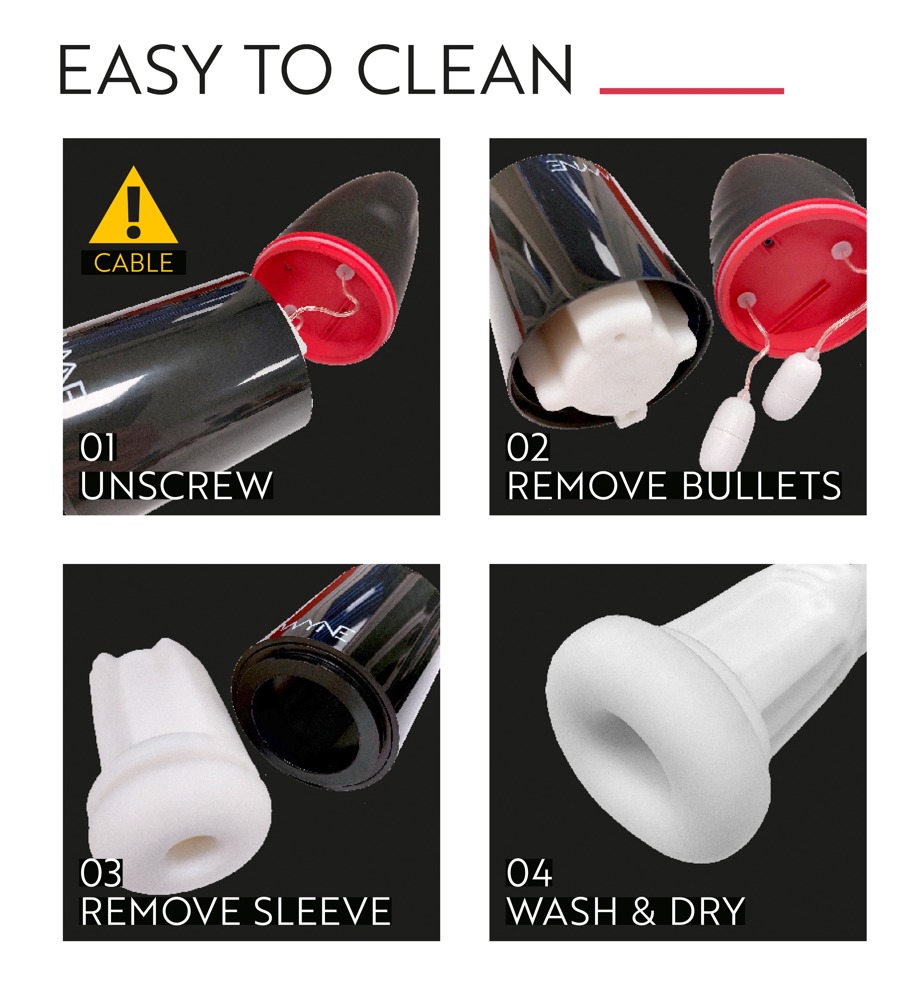 Carcasa exterioara este realizata din ABS, iar mansonul moale din TPE cu textura Soft Touch are striatii pe interior care ofera un masaj exceptional. Acesta poate fi scos pentru o curatare usoara. Masturbatorul poate fi depozitat discret si protejat de praf cu capacul de protectie inclus.