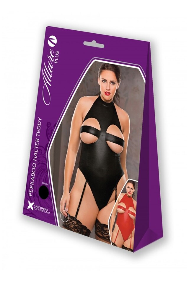 Body provocator din material cu aspect glossy prevazut cu decupaje pe cupe si portjartier ajustabil.