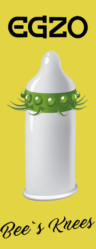 Prezervativ Egzo Bee’s Knees cu o banda verde in jurul varfului penisului cu tepi moi si margele, oferind noi senzatii in timp ce maresc circumferinta penisului.