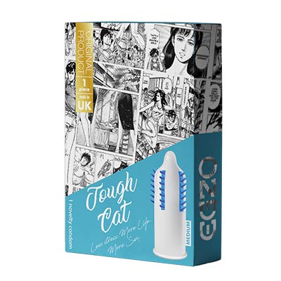 Prezervativ Egzo Tough Cat cu 3 benzi albastre cu tepi de-a lungul penisului penisului, oferind noi senzatii in timp ce maresc circumferinta penisului.