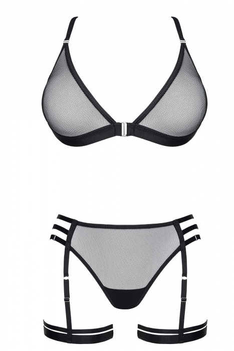 Un set incitant din plasa neagra, transparenta, placuta la atingere, compus din sutien si bikini cu jartiere.