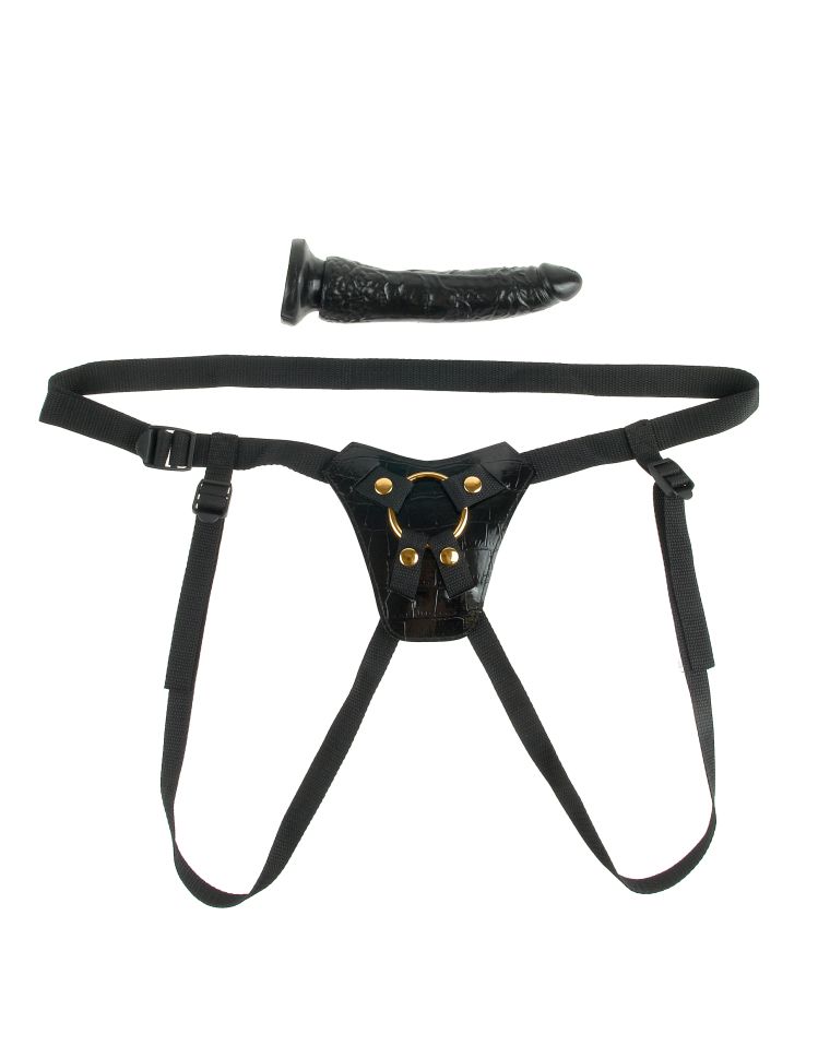 • Chilotul contine un inel auriu stralucitor, de care se ataseaza dildo negru inclus sau orice alt dildo cu ventuza.