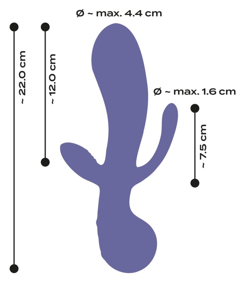 Lungime totala 22 cm. Ax: lungime de introducere 12 cm. diametru 2,6 cm – 4,4 cm. Stimulator anal: 7,5 cm lungime, diametru 0,9 cm – 1,6 cm. Greutate 234 g.